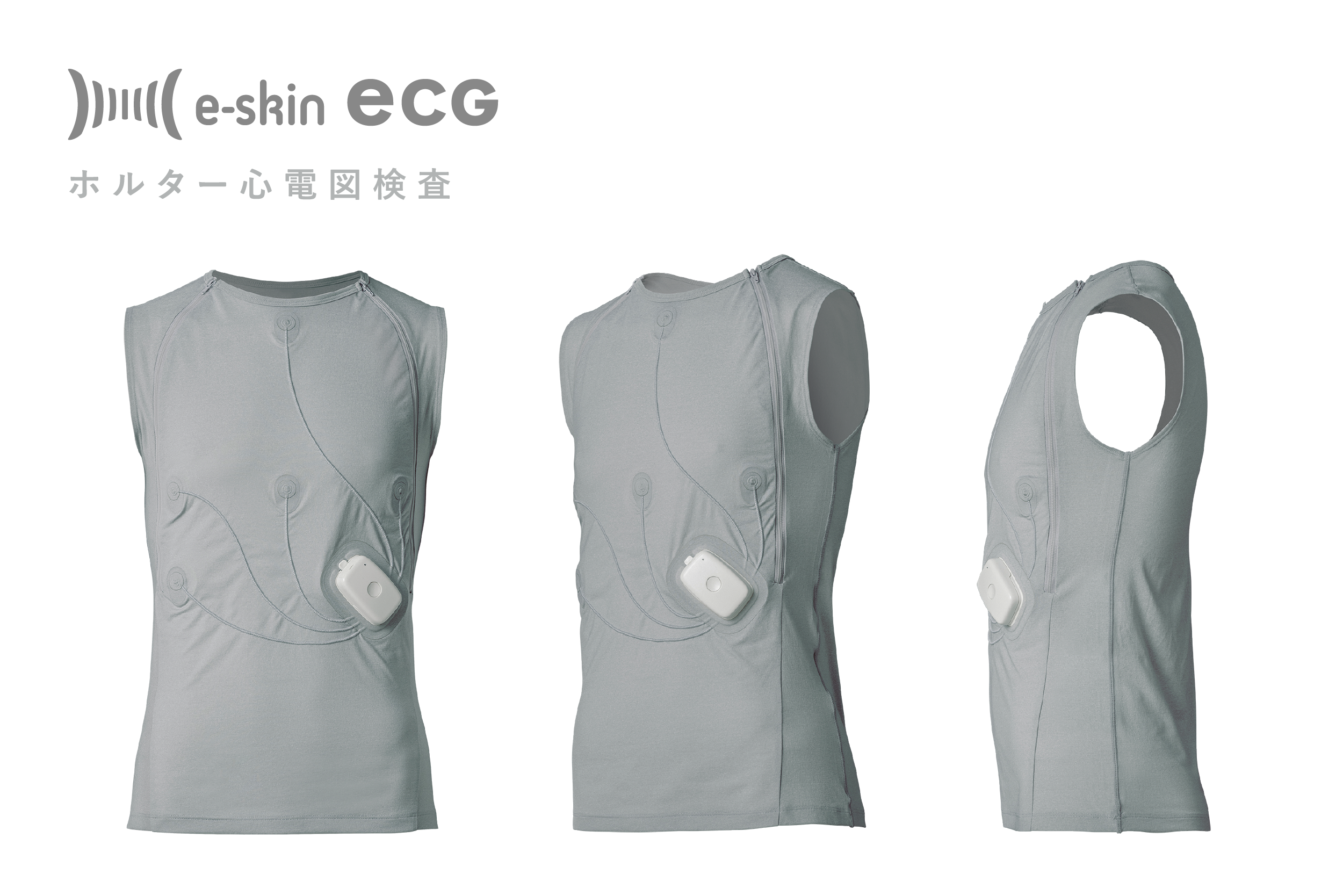 e-skin ECGは3誘導(CM5、CC5、NASA)のホルター心電図検査サービスです。慶應義塾大学病院との共同研究を経て開発された着衣型の心電図計測システムにより、医療従事者を介せず受検者自身で安心して着脱できるようになりました。機器の購入は不要で、必要な時に申し込みをするだけです。Xenomaが受検者へのサポート対応から解析レポートの提出まで一貫して担当するため、従来に比べて医療従事者の業務負荷を削減します。